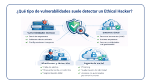 El principal aporte del Ethical Hacker es la detección temprana de vulnerabilidades. Estas pueden incluir fallas técnicas, configuraciones incorrectas, debilidades en controles de acceso o errores en la lógica de aplicaciones y procesos.