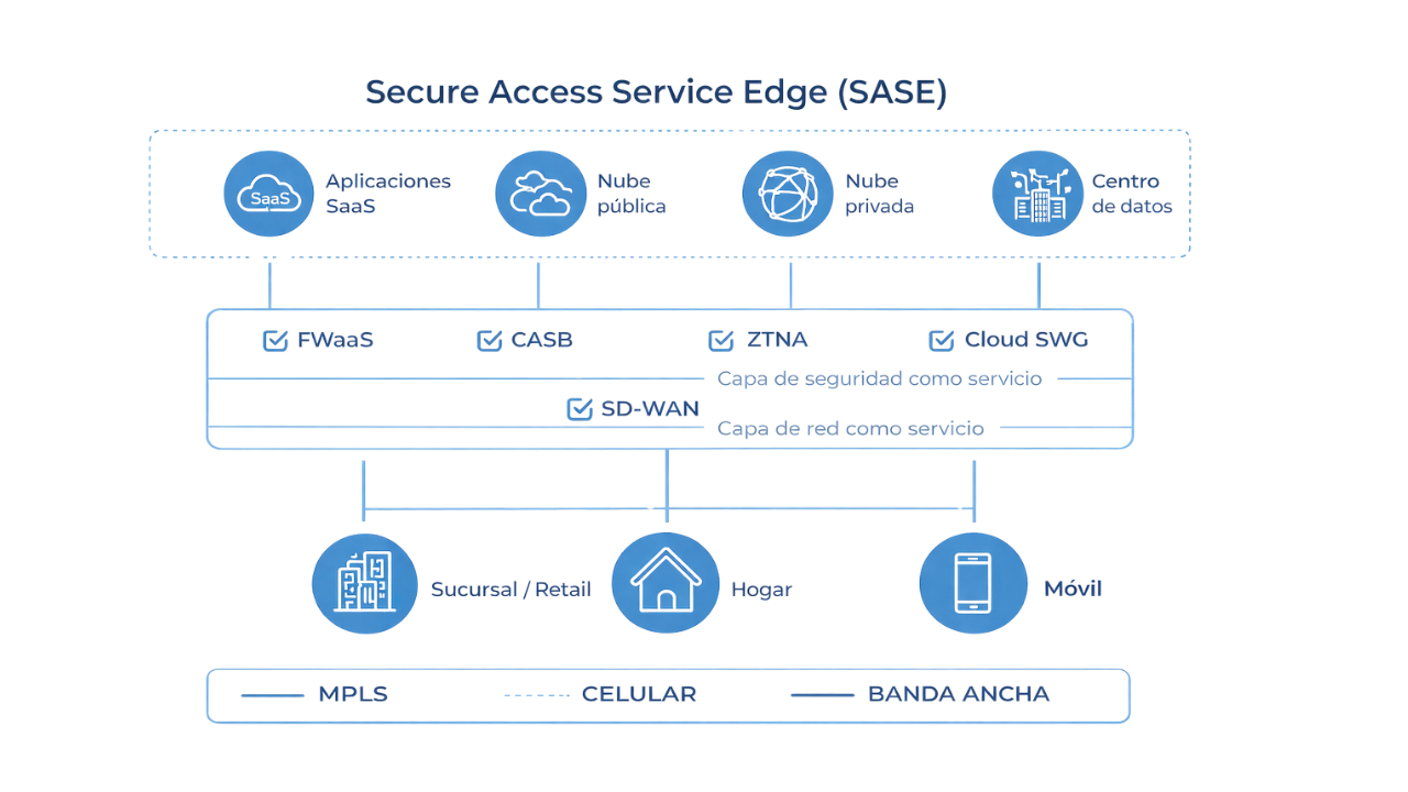 SASE combina networking y seguridad en una arquitectura cloud unificada.