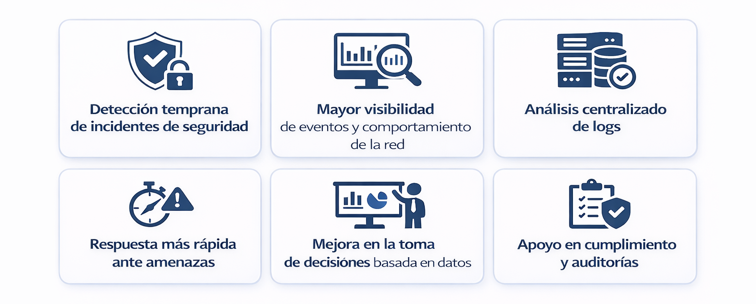Muchas organizaciones cuentan con soluciones de seguridad implementadas, pero carecen de una gestión centralizada de logs y eventos, lo que dificulta detectar amenazas a tiempo, correlacionar incidentes y tomar decisiones informadas. Esto puede generar alertas no gestionadas, ataques no detectados y una respuesta tardía ante incidentes críticos que afectan la continuidad operativa.