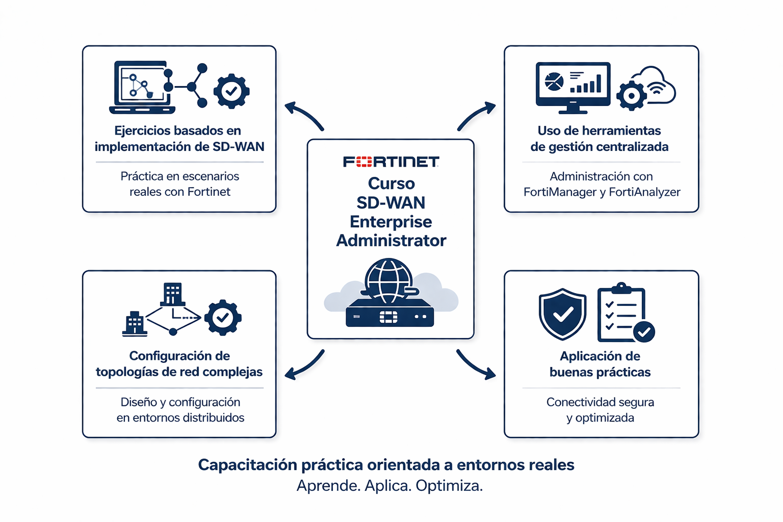 El curso SD-WAN Enterprise Administrator permite implementar una red inteligente, capaz de optimizar el tráfico, priorizar aplicaciones críticas y mejorar la resiliencia de la infraestructura, entregando mayor control y visibilidad sobre la conectividad empresarial.